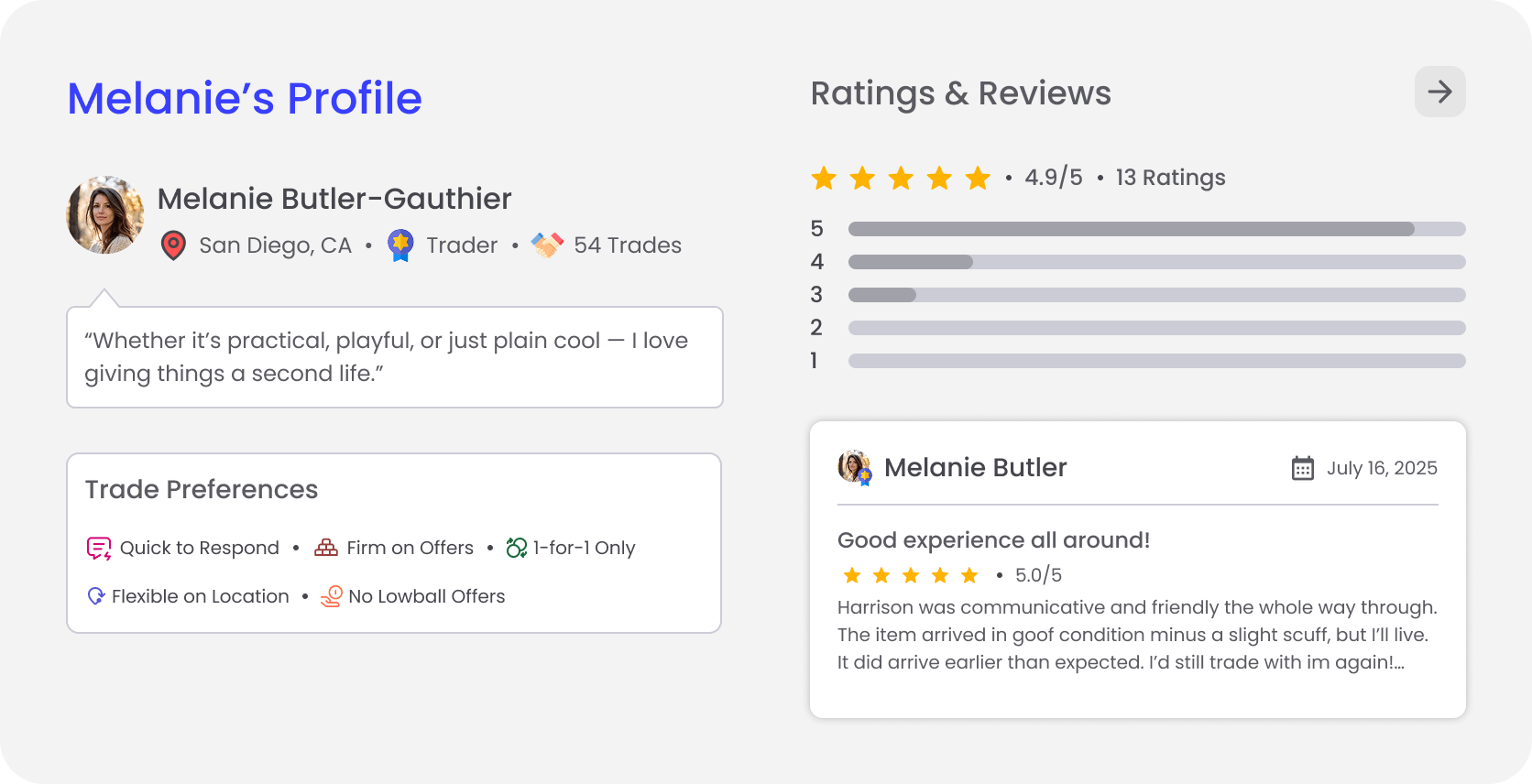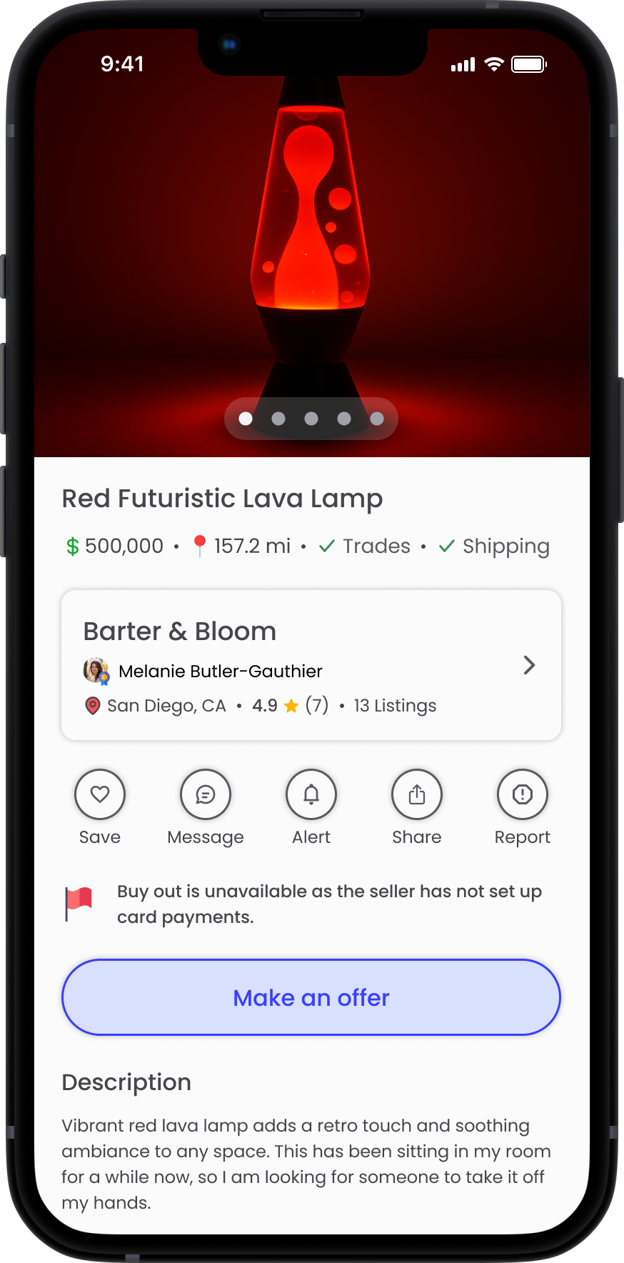 Designing for a barter-based marketplace introduced unique UX challenges. Unlike traditional buying flows, trades require negotiation and flexibility, so the interface needed to support multiple trade scenarios without becoming complex. This project reinforced the importance of balancing flexibility with clarity when designing systems that rely on user trust and interaction.