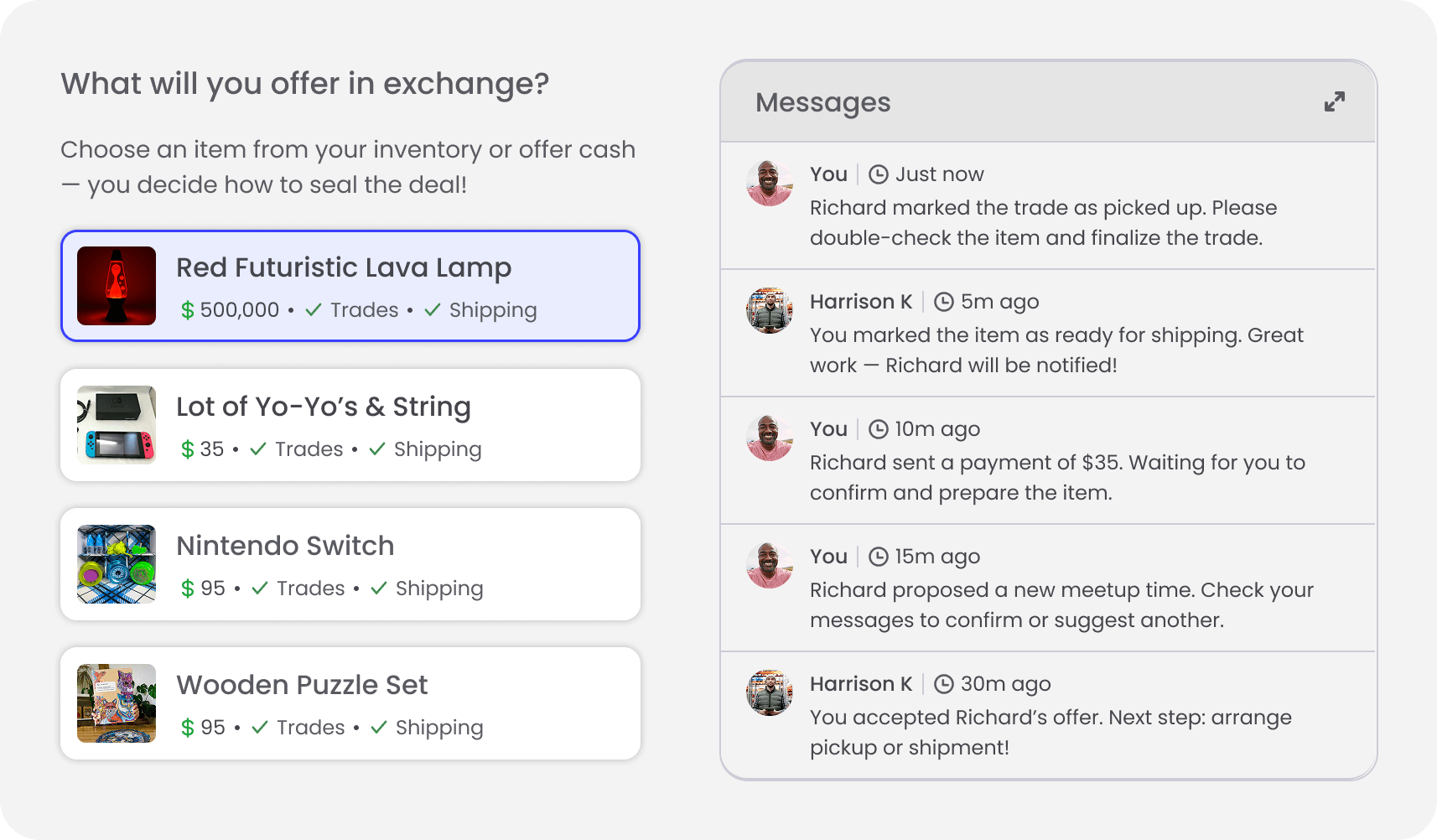 Instead of traditional buying and selling, the platform encourages flexible deal-making where users can trade items, combine offers, or include cash adjustments.